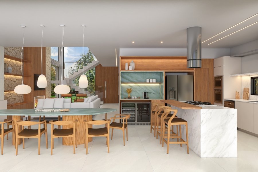 A casa foi projetada para trazer um ambiente harmônico, com ambientes amplos e integrados, perfeito para receber os amigos.