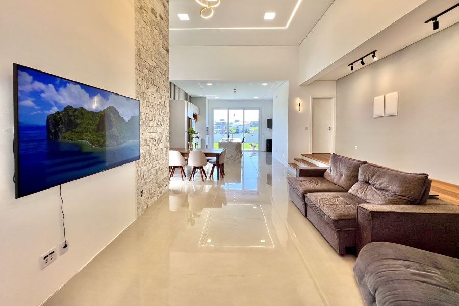 A garagem comporta até 4 veículos, e a fachada contemporânea possui iluminação em LED, reforçando o padrão moderno do imóvel.