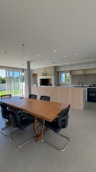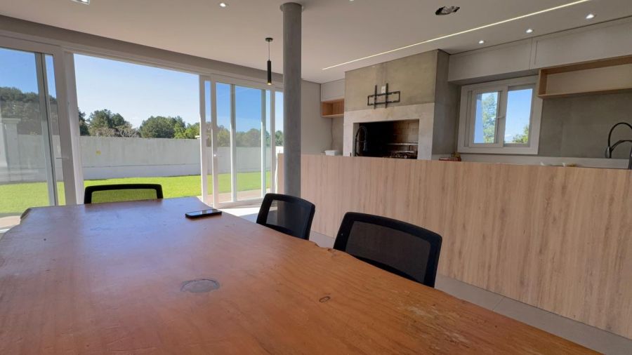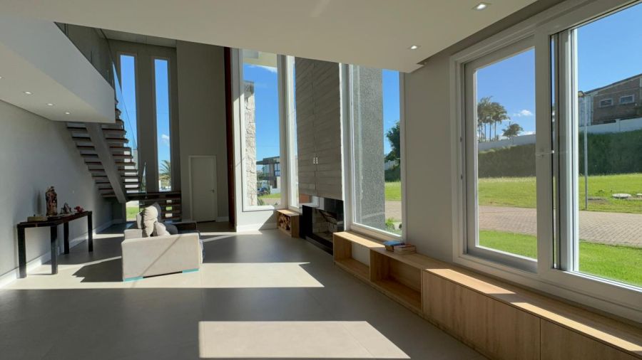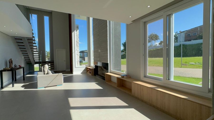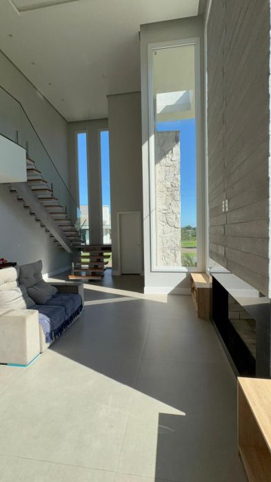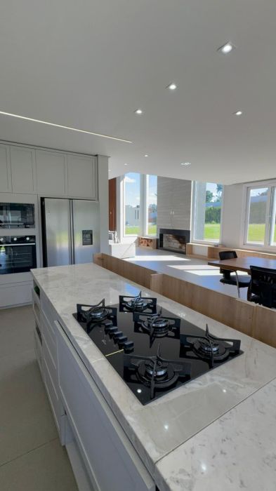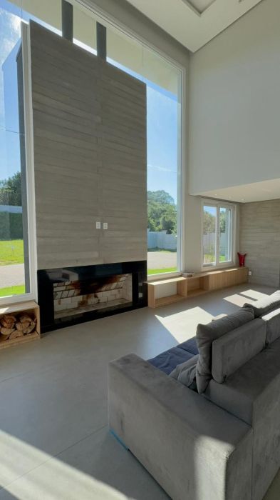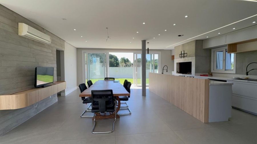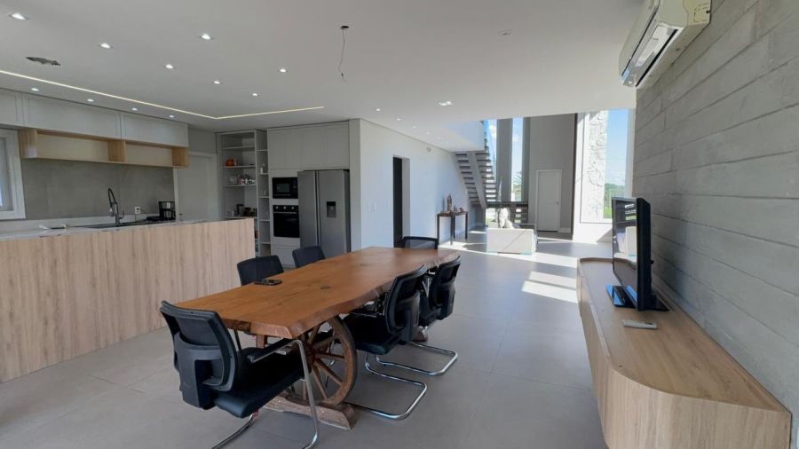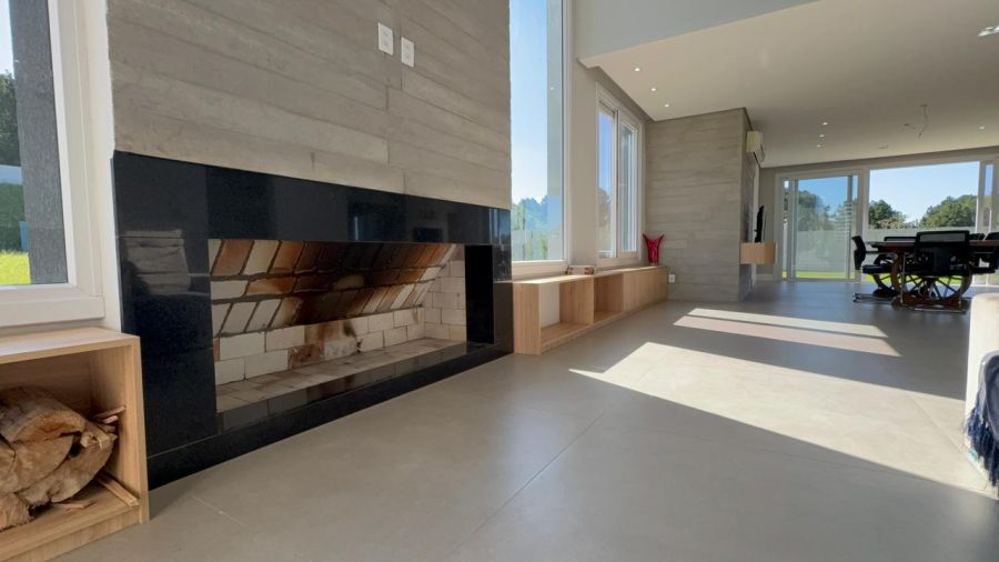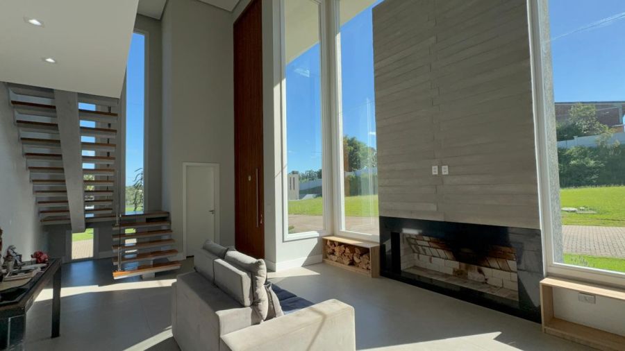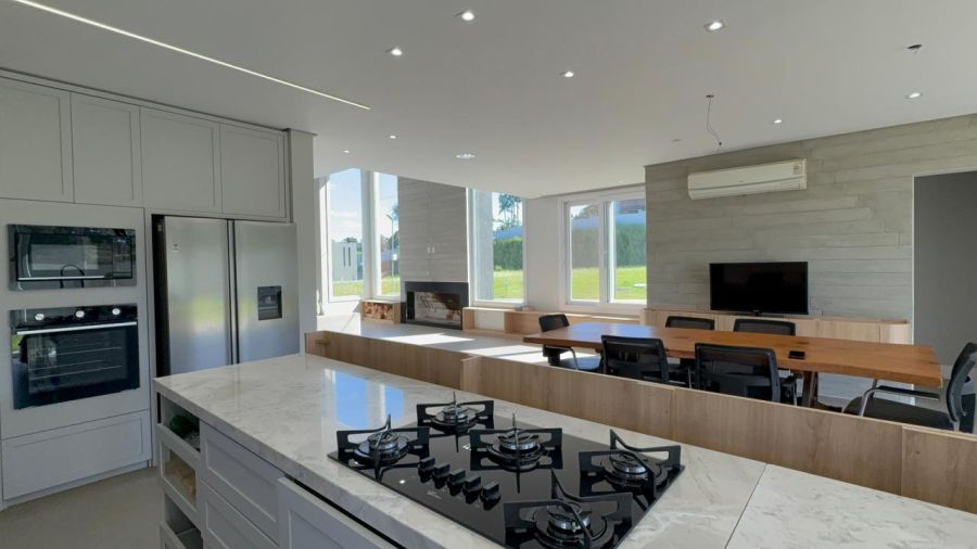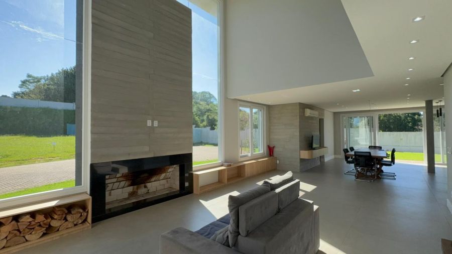 No pavimento inferior, o destaque fica para o living integrado em conceito aberto, conectando sala de estar, jantar e cozinha de forma fluida e funcional, com lareira e espaço gourmet com churrasqueira, ideal para momentos em família e para receber convidados.