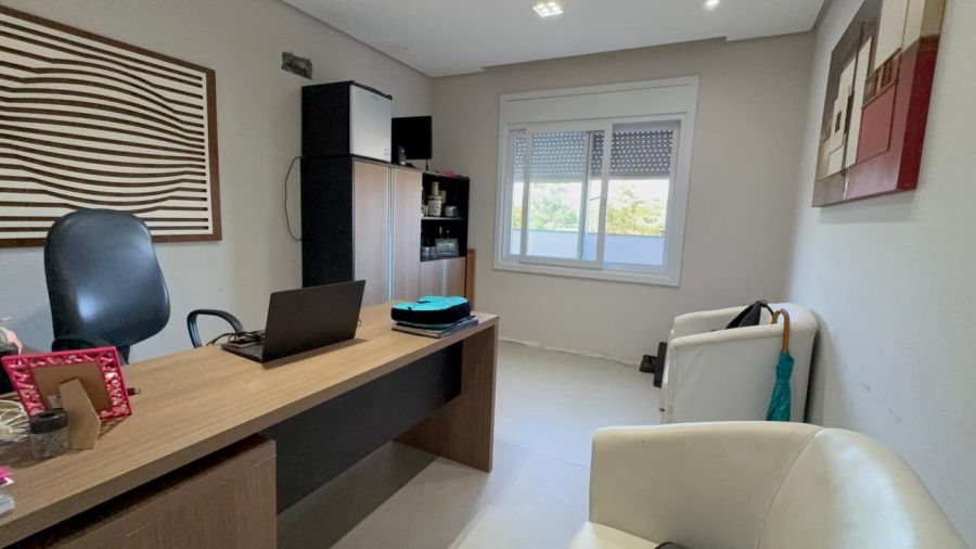 O imóvel conta também com escritório com banheiro, podendo ser utilizado como uma suíte no térreo, área de serviço e dois lavabos, totalizando seis banheiros no total.